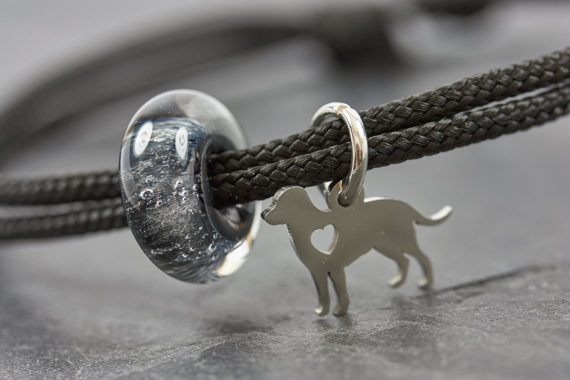 Die Asche ihres verstorbenen Haustieres wird sorgfältig in transparentem und farbigem Borosilikatglas eingeschmolzen. Eine Erinnerung für die Ewigkeit. Die hier abgebildeten Anhänger zeigen alle eingeschmolzene Asche. Wenn Haare ins Glas eingearbeitet werden hinterlassen sie einen Kohlestaub Schleier und kleine Bläschen im Glas. (Ähnlich wie beim Armband mit der Glasperle)